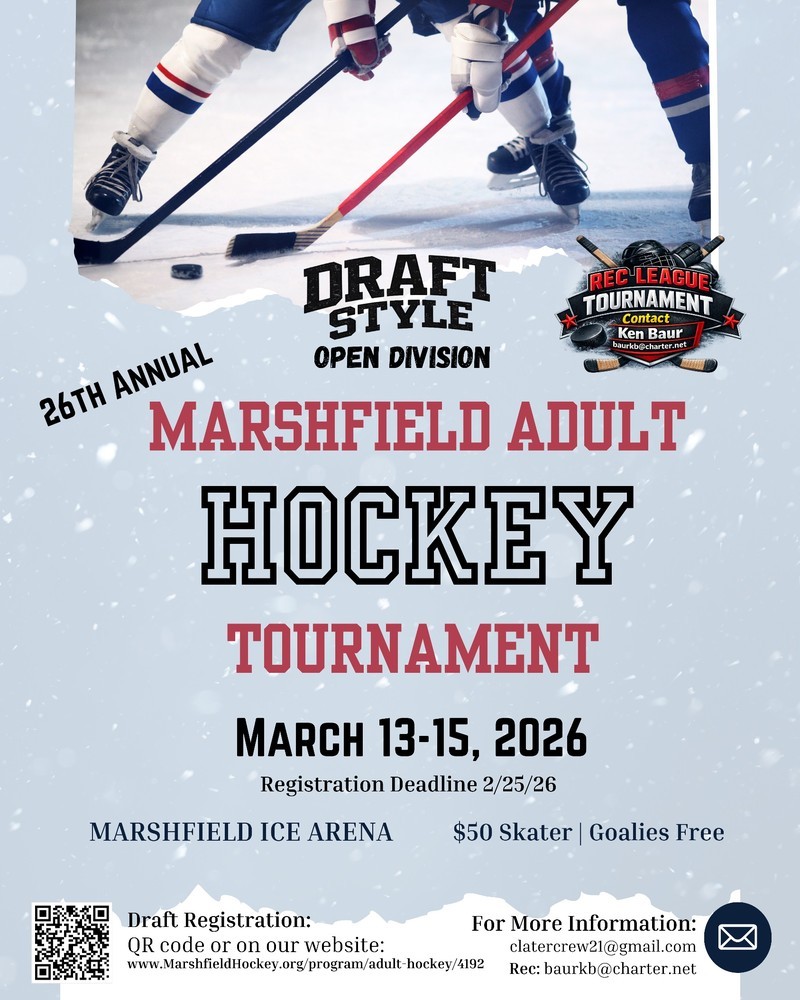 Join us at the rink on March 13th-15th, 2026 for our 26th Annual Marshfield Men's Hockey Tournament!!